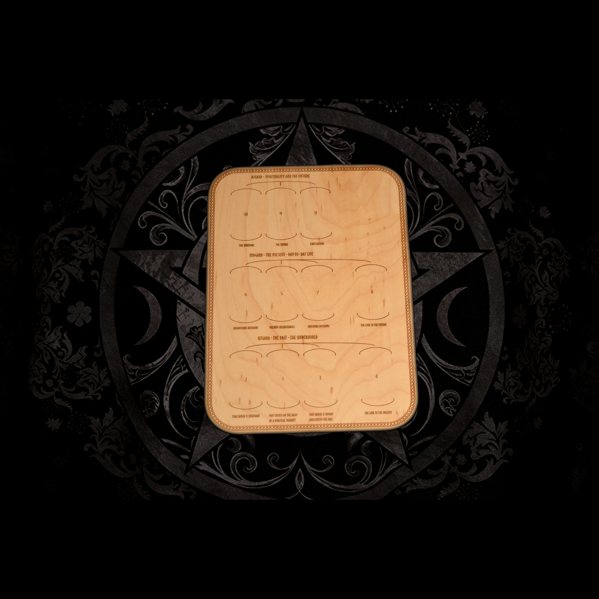 Le plateau de lecture de runes, fabriqué en érable plaqué de qualité avec inscriptions : Asgard - Midgard - Utgard Numéroté de 1 à 11 avec une courte description sous chaque rune Si vous êtes dans l'outil de divination, cet épandeur est un incontournable pour mal comprendre les runes. 8,5 x 6,5 pouces (220 mm x 166 mm x 5 mm) Plus facile à lire, très portable et abordable !!
