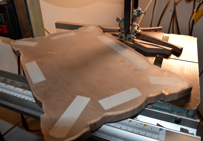 Cutting the Wood: Excess wood is expertly cut away using an industrial bandsaw, shaping the board to its initial form.