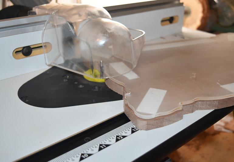 Routing the Board: The board and template are placed on a router table, where the design begins to take shape through precise routing.