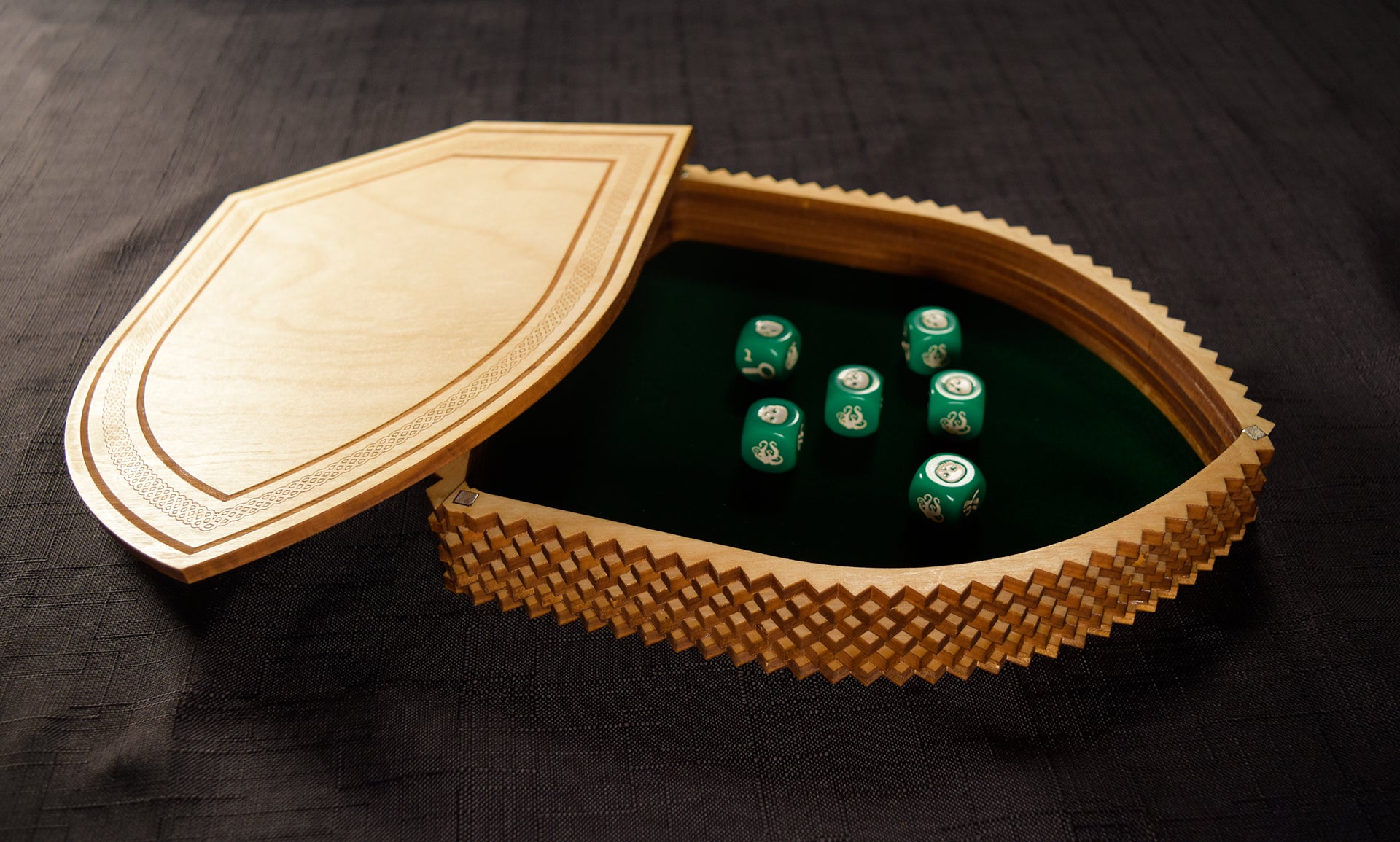 Elevate your gaming experience with this exquisitely crafted Beatus Lignum Dice tray. The shield-shaped wooden tray features an intricately designed exterior with a distinctive crosshatch pattern along its edges, adding both visual appeal and grip. The interior is lined with premium green felt, providing a soft, quiet surface for rolling dice. The lid displays a beautifully engraved shield design with custom monogram detailing, transforming this functional piece into a statement accessory for your gaming table. Perfect for tabletop RPGs, board games, or any dice-based gaming sessions, this tray keeps your dice contained while adding a touch of sophistication to your gaming setup. The thoughtful design ensures your dice rolls stay within bounds, protecting both your dice and your playing surface. When not in use, the matching magnetic lid securely covers your dice, making storage and transport effortless.